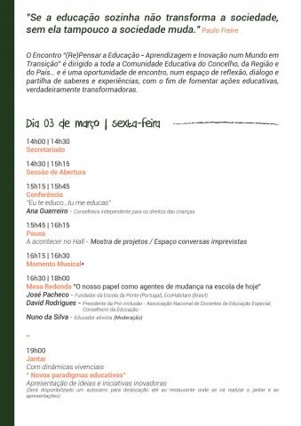 Vamos "Re-pensar a Educação", no Algarve, de 3 a 5 de março de 2017. Diversos encontros de partilha e aprendizagem, onde vamos também revelar o trabalho desenvolvido pela Florescer - Associação de Educação Global e pela Rede Educação Viva. Várias pessoas, entidades associativas, públicas e privadas reunidas por uma "Aprendizagem e inovação num mundo em transição".